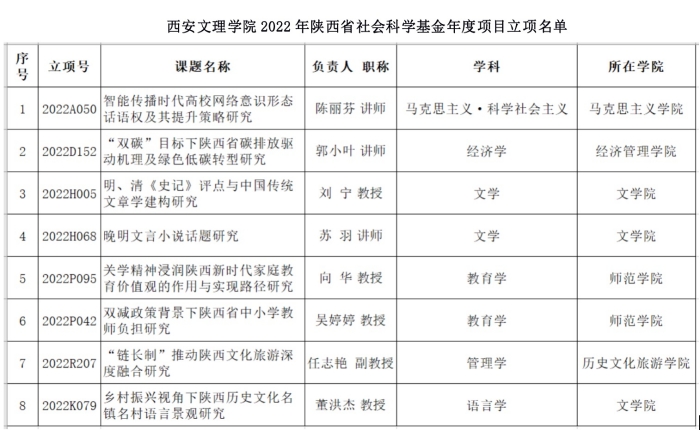 8月11日,陕西省哲学社会科学工作办公室公示了2022年度陕西省社科基金年度项目拟立项名单,我校拟获批8项,拟立项总数较去年提升显著。 本年度项目中我校拟立项项目涉及6个学科,分别为教育学2项,文学2项,马克思主...