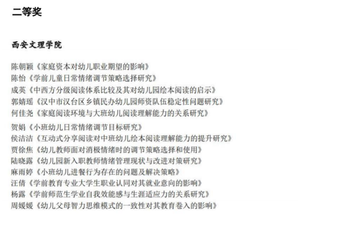 近日,由浙江教育报刊总社《幼儿教育》编辑部主办的第十六届全国高校学前(幼儿)教育专业优秀毕业论文评选活动结果揭晓。我校学前教育学院2022届毕业论文共有42篇获奖,其中,二等奖13篇,三等奖29篇。 本次评选活动...
