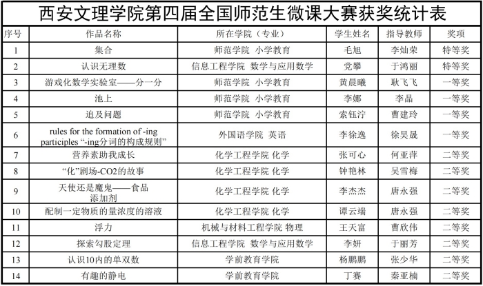近日,第四届全国师范生微课大赛落下帷幕。我校参赛作品从来自全国162所院校的2703份作品中脱颖而出,获得14个奖项,其中特等奖2项,一等奖4项,二等奖8项。我校被评选为大赛优秀组织单位,李灿荣、于鸿丽被评选为优...