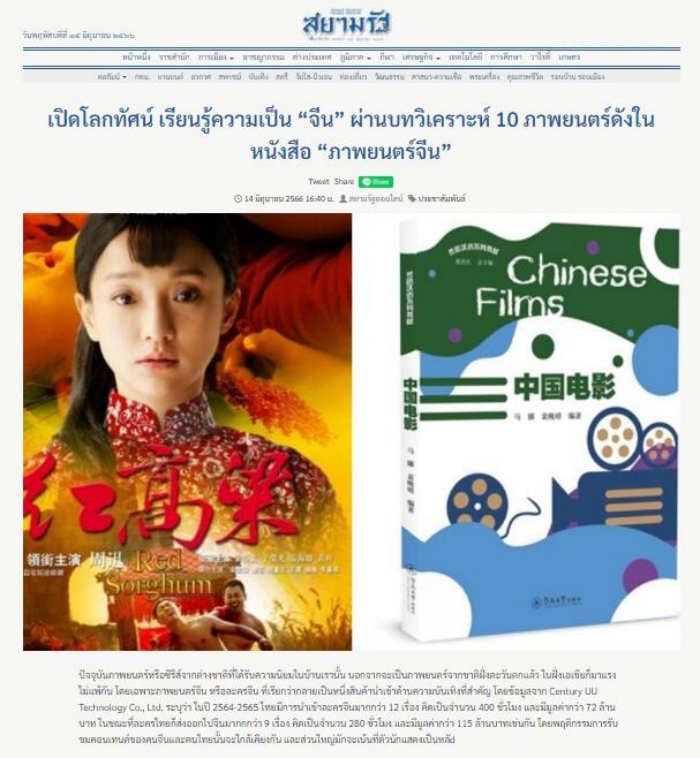 6月14日,由我校文学院教师马娜、袁晚晴合著的《中国电影》登上泰国主流媒体《暹罗早报》。 《暹罗早报(Siam Rath)》创办于1950年,是泰国历史最悠久的日报,泰国国内最具影响力的泰文报纸,主要提供经济、宗教、体...