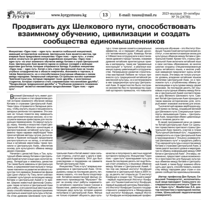 10月10日,我校教师董洪杰在吉尔吉斯坦《旗帜报》发表题为《扬丝路精神 促文明互鉴 达民心相通》的署名文章。文章回顾了古代丝绸之路上语言文化交流的悠久历史,分析了“一带一路”倡议提出十年来中国与中亚文明互鉴...