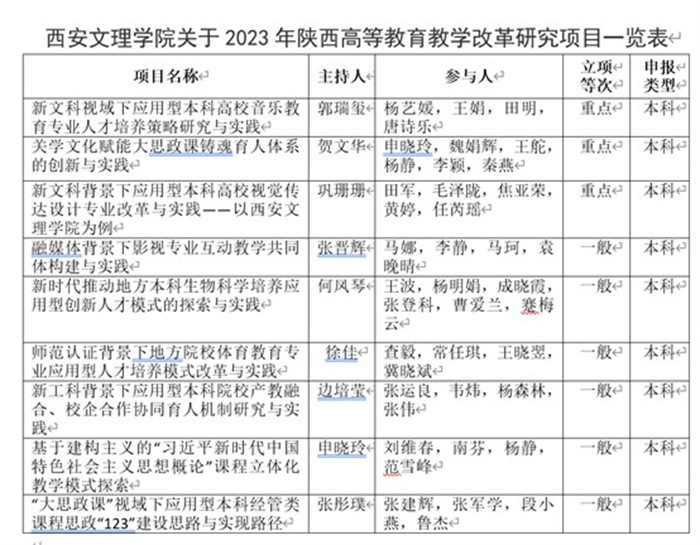 近日,省教育厅对2023年度陕西高等教育教学改革研究项目拟立项项目进行了公示,拟批准509个项目为2023年度本科和高等继续教育教学改革研究项目。我校成功获批立项9项,其中重点项目3项。立项数量为历史最好成绩,列同...