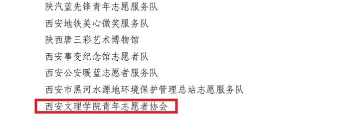 近日,中共西安市委文明办、西安市民政局对2023年度西安市三星级、四星级志愿者志愿服务组织(团体)名单进行了公示。我校青年志愿者协会荣获三星级志愿者志愿服务组织。这一成果彰显了我校在积极培育和践行社会主义...