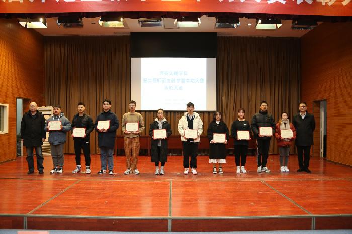 大会第一项首先由学生代表进行诗歌朗诵和书法展示。第二项由评估办副主任王晓翌宣读《西安德赢VWIN学院关于第二届师范生教学基本功大赛的表彰决定》。大会第三项由副校长韩权、教务处处长徐东升、评估办主任王光、师范学院教学副院长王华、学前教育学院教学副院长路娟分别为一、二、三等奖获得者办法获奖证书。