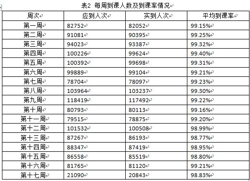 根据课程安排,应参加在线学习的学生9629人,其中第十七周应参加在线学习的学生21090人次,实际上课人数20843人次,平均到课率为98.83%。每周到课人数及到课率情况如表2所示。