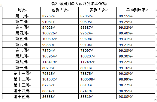 根据课程安排,应参加在线学习的学生9629人,其中第十五周应参加在线学习的学生86558人次,实际上课人数85519人次,平均到课率为98.80%。每周到课人数及到课率情况如表2所示。
