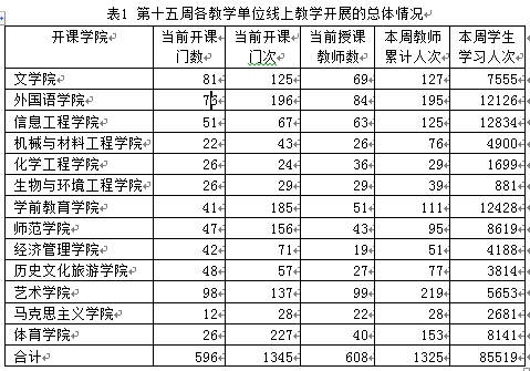 自2月24日以来,我校2020年春季学期线上教学已开展十五周。在校党委正确领导和广大师生共同努力下,新学期线上教学工作总体上运行平稳、有序进行。现将第十五周的线上教学运行情况汇总如下: