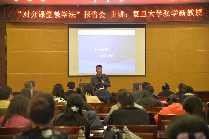 为探索课堂教学改革新形式,促进人才培养质量提升,12月28日上午,学校在办公楼一楼会议室举办“对分课堂教学改革报告会”,邀请复旦大学张学新教授作主题报告。我校副书记、副校长李忠良、各学院院长、教学副院长、教研室主任、教师代表、教务处全体干部共140余人参加报告会。副书记、副校长李忠良主持会议。