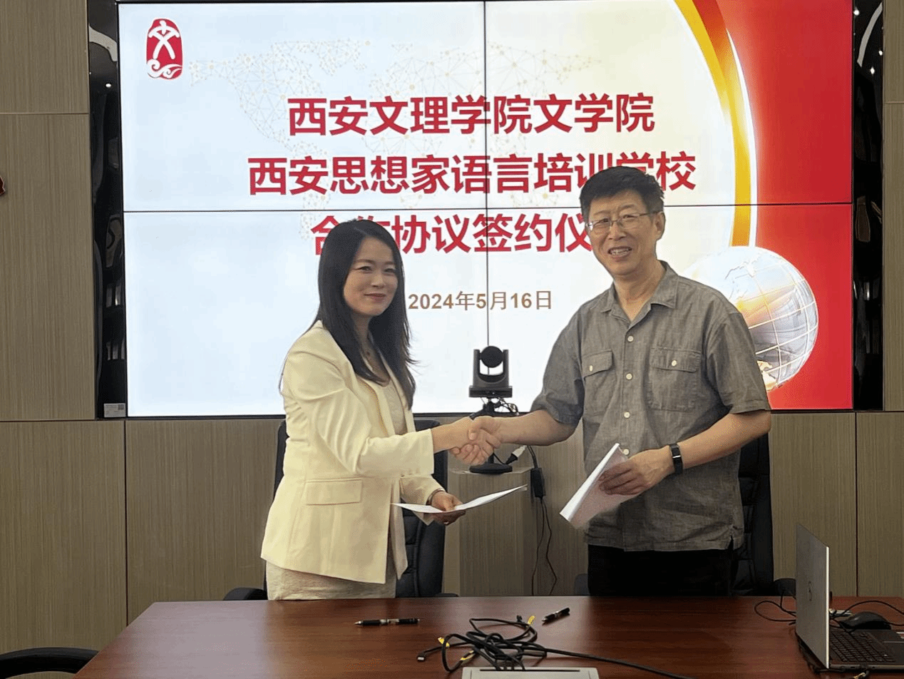 5月16日上午,我校文学院与西安思想家语言培训学校签订合作协议。西安思想家语言培训学校校长李盼盼及两名教师代表,文学院院长郝延军、副院长董洪杰、汉语国际教育专业系主任林贤参加了仪式。
