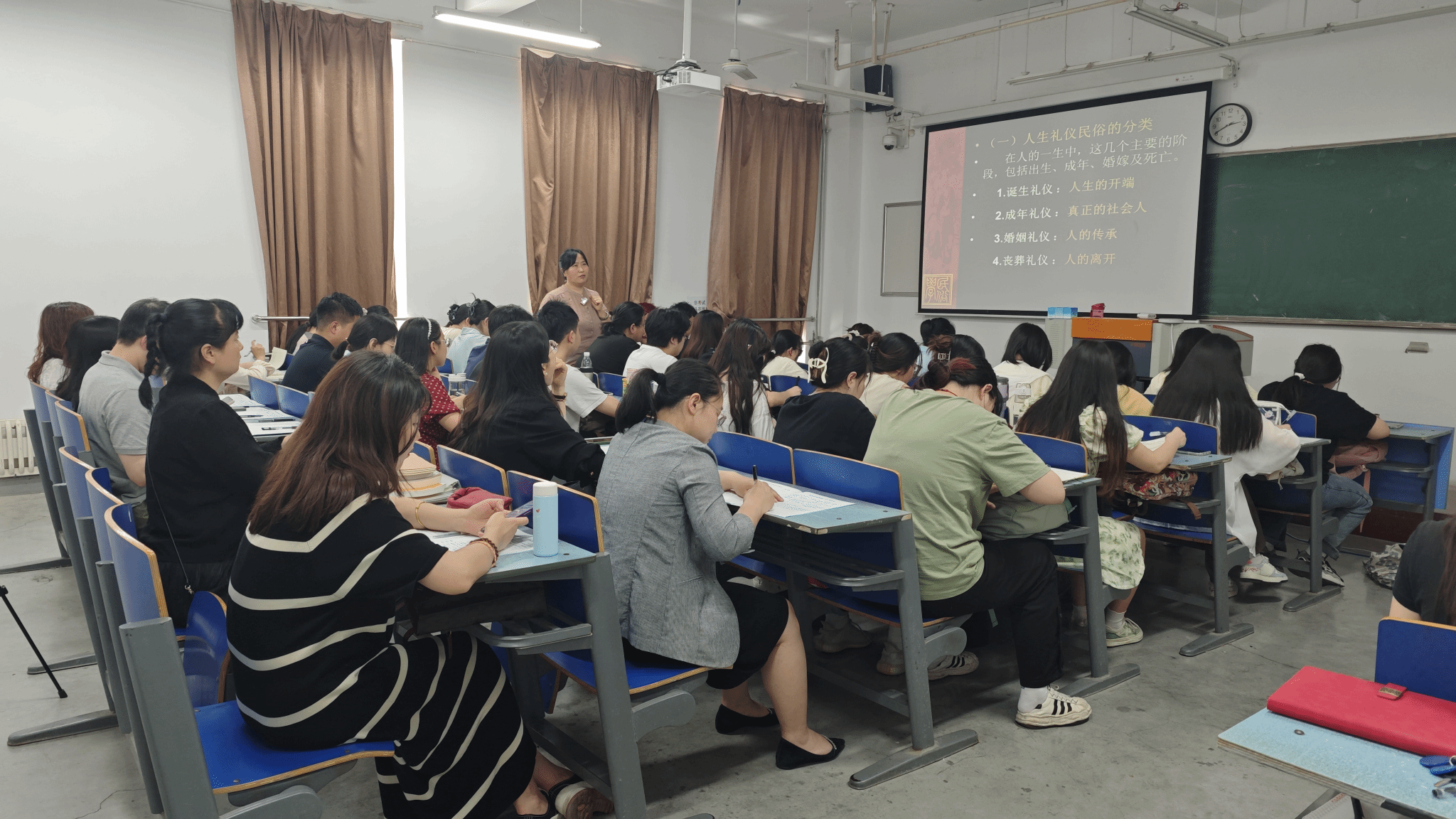 李喜霞教授课堂开始后回顾上节课中国民俗时节的相关内容,并向同学们推荐相关书籍,以便对课堂内容的巩固。随后正式进入对“人生礼仪民俗”的讲解,期间讲到重点内容时提醒学生记笔记,避免出现漏记的情况。采用视频资源向同学们介绍部分地区的习俗,使同学们了解更加全面。