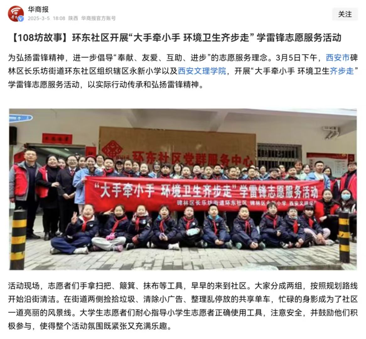 3月3日—7日,学前教育学院联合高新区丈八街道甘家寨社区、碑林区长乐坊街道环东社区、碑林区永新小学,共同举办“大手拉小手,环境卫生齐步走”学雷锋志愿服务活动。活动被《华商报》《三秦都市报》等多家主流媒体相继报道,展现了我校学生践行雷锋精神、服务社会的责任担当。