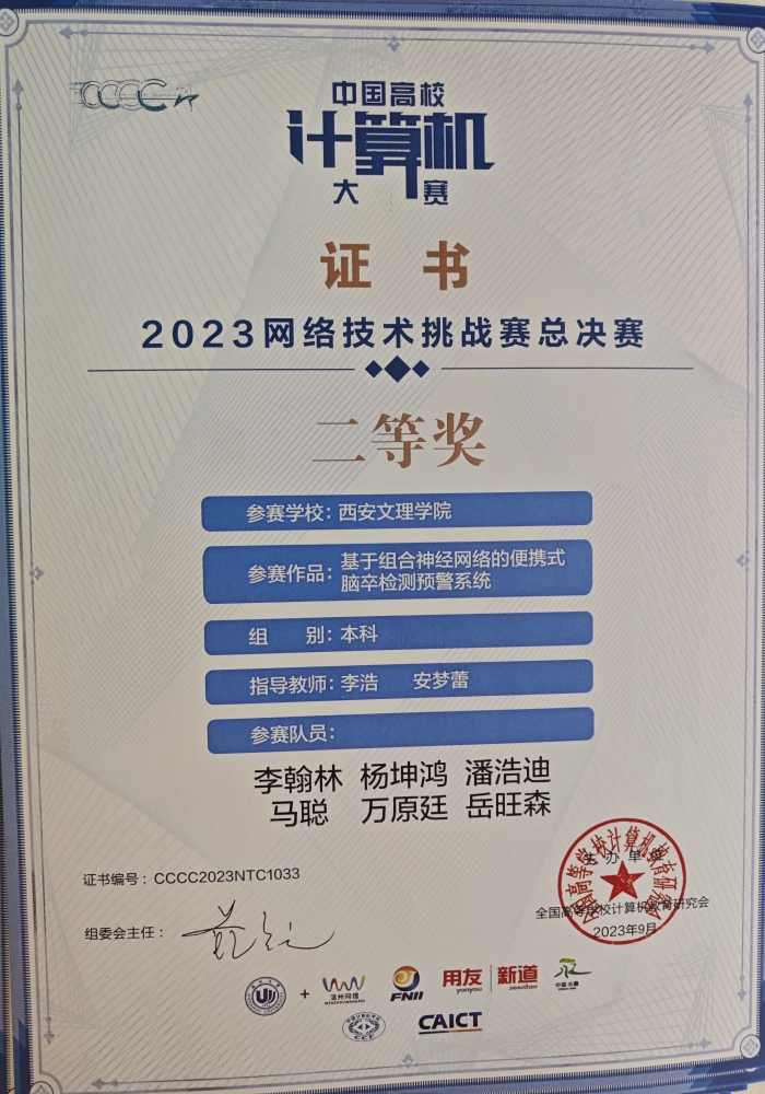 9月9日,第八届中国高校计算机大赛-网络技术挑战赛全国总决赛在温州大学落下帷幕,信息工程学院学生李翰林、马聪、杨坤鸿等(李浩、安梦蕾老师指导)经过激烈角逐最终获得国家级二等奖。