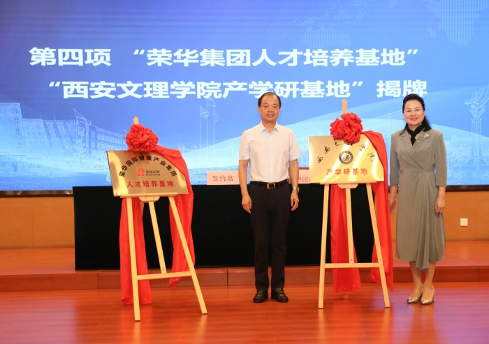 7月4日,我校与荣华控股企业集团校企合作签约暨揭牌仪式在学校办公楼会议室举行。荣华控股企业集团董事长崔荣华、执行总裁郝晓婵,党委书记王育选、校长陈刚,党委委员、校务委员鲍锋出席仪式,校务委员徐东升主持仪式。双方签订产学研校企合作框架协议,并为“荣华国际健康产业集团人才培养基地”、“西安德赢VWIN学院产学研基地”揭牌。