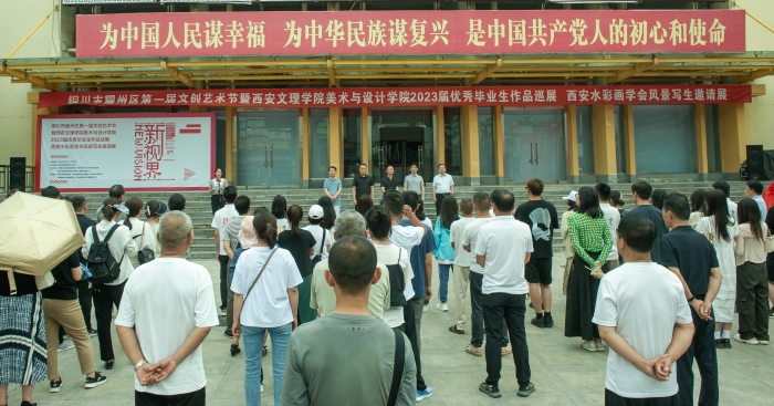 7月5日,“铜川市耀州区第一届'文创艺术节'暨西安德赢VWIN学院美术与设计学院2023届优秀毕业生作品巡展、西安水彩画学会风景写生邀请展”启动仪式在铜川市耀州区宣传文化中心成功举办。我校工会主席范宏,铜川市耀州区副区长李岩,美术与设计学院院长田军,铜川市耀州区文化和旅游文物局局长杨涛、副局长孟根凤、图书馆馆长孙兆君、文化旅游产业投资开发有限公司副经理张伟,西安水彩画学会副会长宋卫东,西安金桔树文化传媒有限公司总经理李攀峰,陕西观典文化传播有限公司副总经理任丽耀,以及我校美术与设计学院各系部主任、在校各年级优秀学生代表、铜川市耀州区文化和旅游文物局、图书馆干部职工、市民代表共一百百五十余人参加仪式。