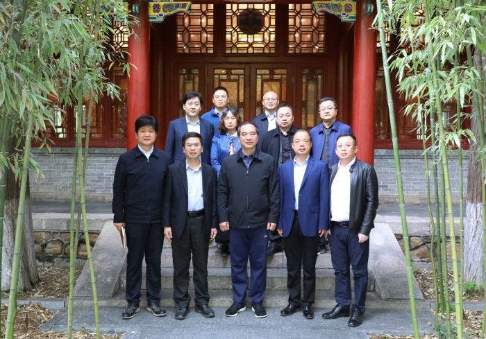 会后,王育选向龚旗煌赠送了学校纪念品--秦岭四库全书,双方领导在临湖轩前合影留念。