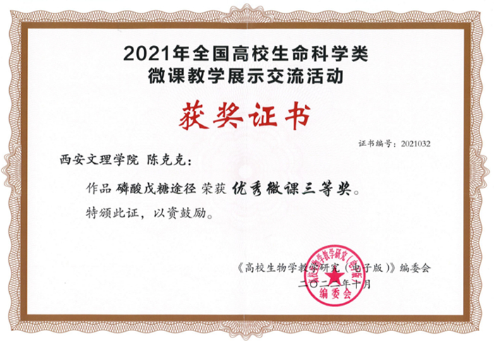 近日,2021年全国高校生命科学类微课教学展示交流活动(原全国高校生命科学类微课教学比赛)评选结果揭晓,我校生物与环境工程学院副教授陈克克的作品--《磷酸戊糖途径》荣获全国三等奖。据悉,此次全国微课教学比赛共有来自30个省(市、自治区)的100余所高校的300余位生命科学类课程(本科)专任教师参赛。