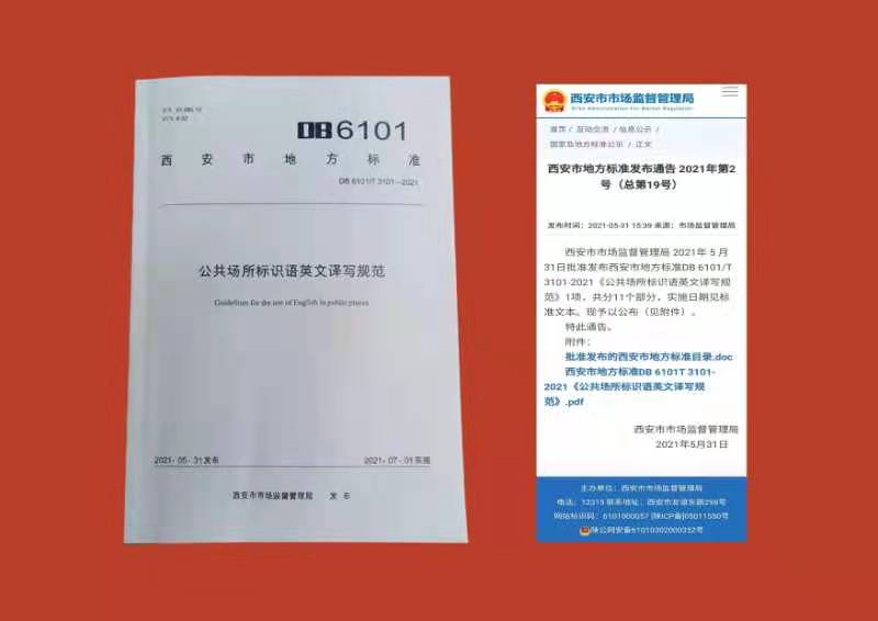 由我校研制的西安市《公共场所标识语英文译写规范》(DB 6101/T 3101-2021)(简称“《规范》”)系列地方标准于2021年5月31日经西安市市场监督管理局批准,面向社会发布并将于7月1日正式实施。