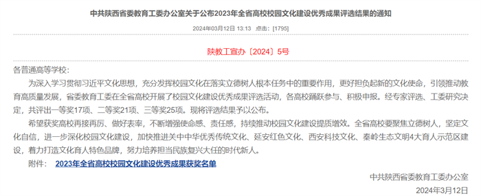 此次校园文化建设优秀成果奖的获得,有助于进一步挖掘“红色文化”育人主题,传承和弘扬延安精神、关学精神,深入挖掘陕西和西安的红色资源和学校的校史资源,为广泛开展革命传统教育、爱国主义教育和铸牢中华民族共同体意识教育等文化活动铸就新的平台。