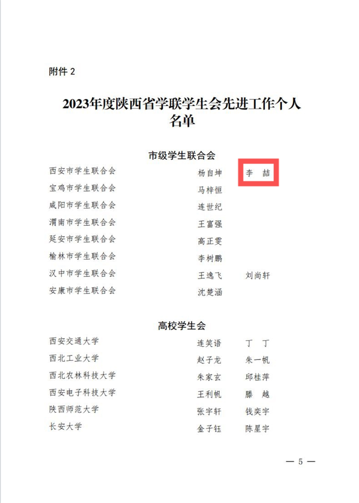近日、陕西省学生联合会印发《关于2023年度陕西学联学生会组织工作述职评议结果的通报》,我校2020级信息工程学院学生、西安市学生联合会主席李喆;2021级马克思主义学院学生、校学生主席团成员张小雨荣获“2023年度陕西省学联学生会先进工作个人”。