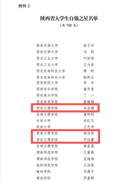 近日,团省委公示了陕西省大学生自强之星寻访活动结果,我校学生淮诗语、刘启熠、乔怡馨被评选为“陕西省大学生自强之星”(陕西共100名),其中淮诗语、刘启熠被推荐参评“中国大学生自强之星”(陕西省57名)。信息工程学院华数云图科创团队被评为陕西省大学生自强之星科创团体(陕西省共20支),该团体是市属高校唯一一个获奖的科创团队,这次评选也创历年之最。