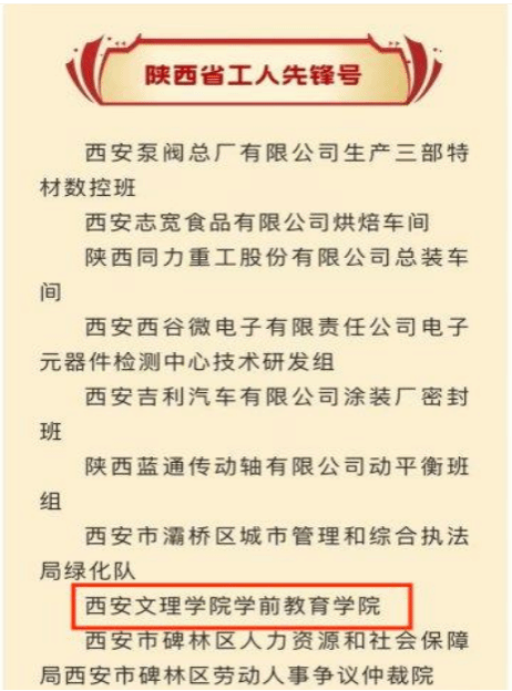 近日,陕西省总工会发布了《关于表彰 2024 年陕西省五一劳动奖和陕西省工人先锋号的决定》,我校学前教育学院被陕西省总工会授予 “陕西省工人先锋号”荣誉称号。
