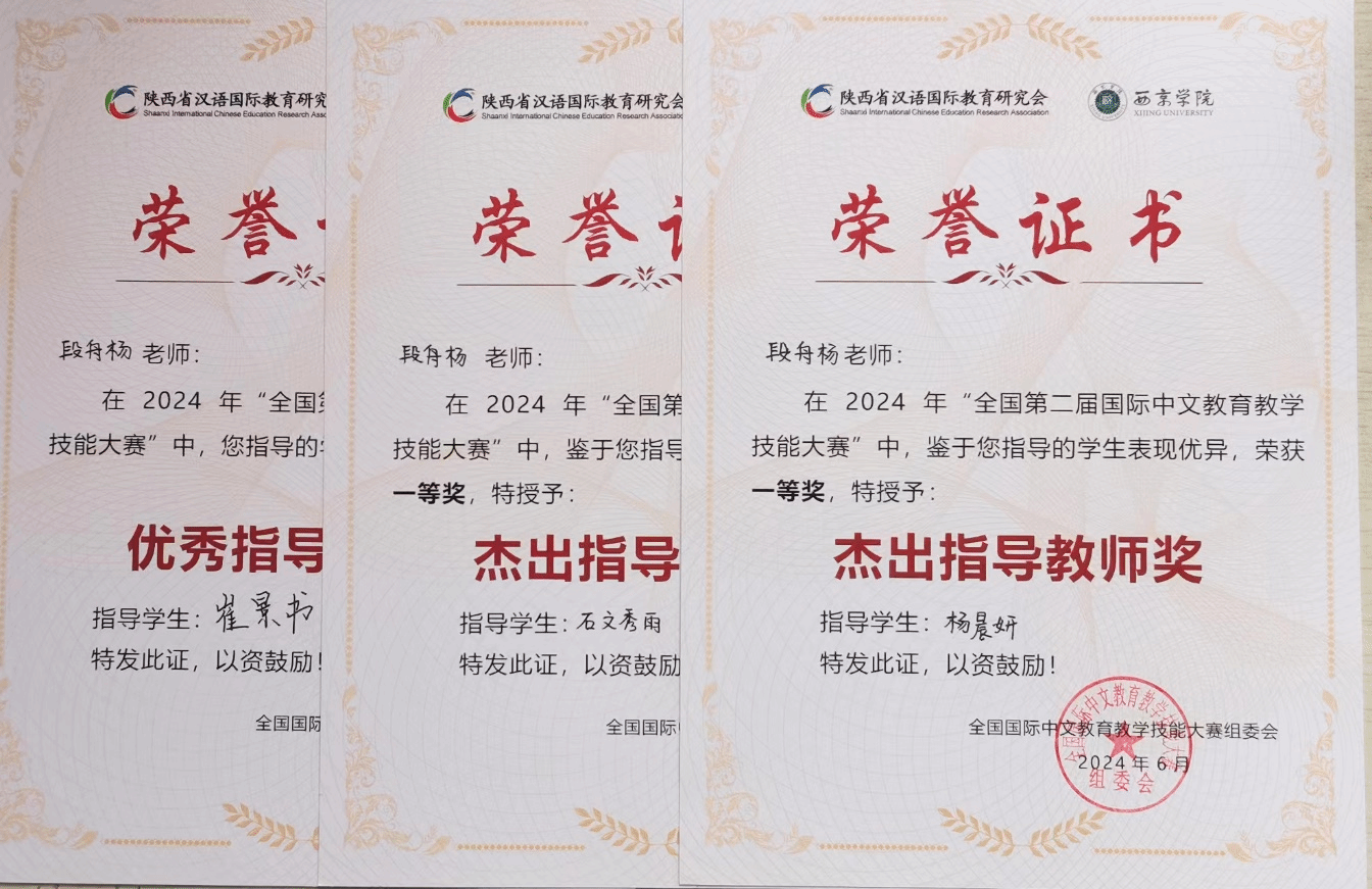 6月1日至2日,由陕西省汉语国际教育研究会与陕西省汉语言文学教指委共同主办、西京学院承办的“全国第二届国际中文教育教学技能大赛”圆满落下帷幕。来自全国116所高校的390位中外选手同台竞技。经过复赛和决赛的激烈角逐,最终我校汉语国际教育专业2021级本科生杨晨妍、2022级本科生石文秀雨两位同学表现优异,双双获得一等奖;2021级本科生崔景书也以自信的表达、娴熟的教学获得了评委的认可,获得本次比赛优秀奖;汉语国际教育专业教师段舟杨作为指导教师荣获杰出指导教师奖。