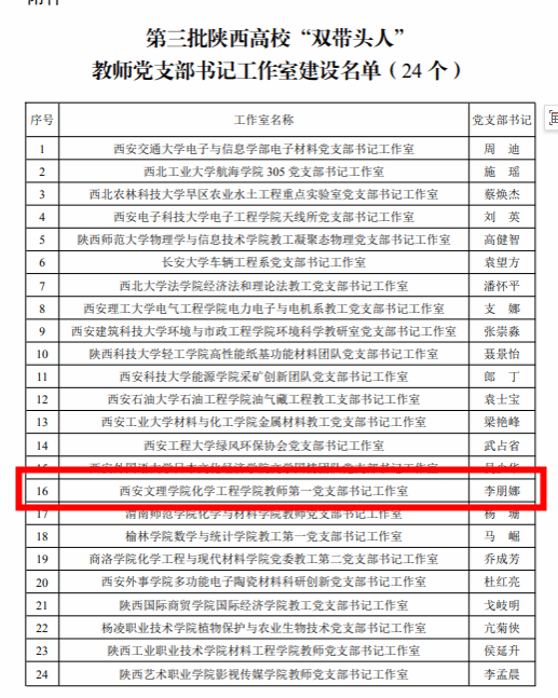 近日,中共陕西省委教育工委公布了第三批陕西省高校“双带头人”教师党支部书记工作室培育创建名单,遴选建设全省高校24个“双带头人”教师党支部书记工作室,我校化学工程学院教师第一党支部书记工作室成功获批立项,这也是我校首个省级“双带头人”工作室。