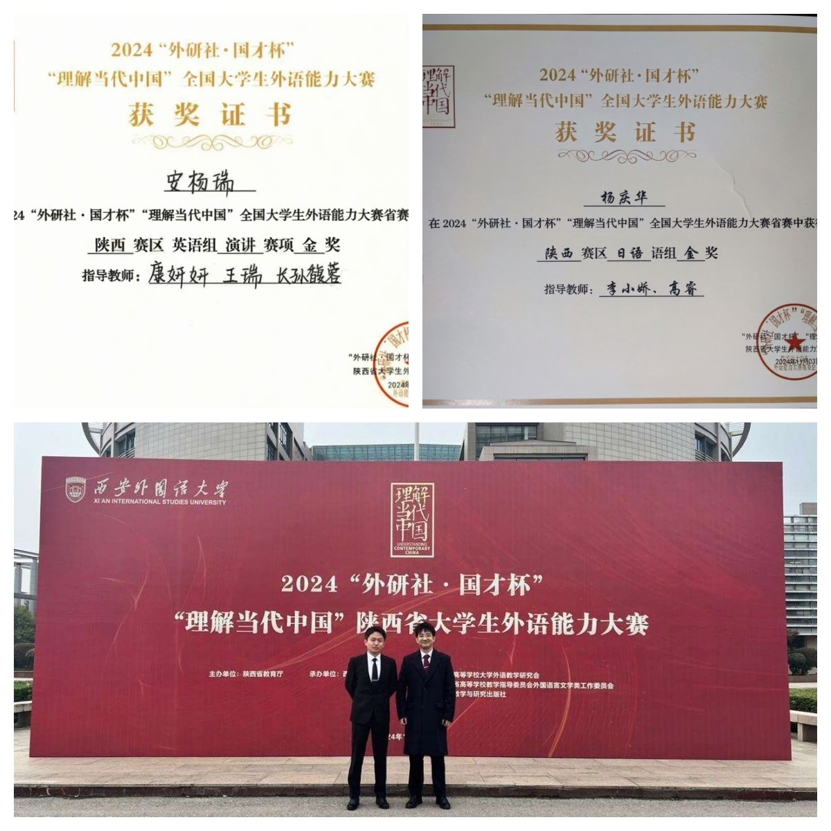 近日,2024年“外研社·国才杯”“理解当代中国”系列赛事陕西省大学生外语能力大赛圆满落幕。来自全省44所高校近百名学子的积极参与,我校11名学生在省赛中喜获佳绩!其中,外国语学院日语专业杨庆华同学在多语种组(日语赛项)中排名全省第六,荣获省级金奖,这也是我校自该赛事成立以来取得的最大突破。外国语学院翻译专业安杨瑞同学在英语组(演讲赛项)中名列全省第八,荣获省级金奖。两位金奖同学,会继续代表我省冲击国赛。