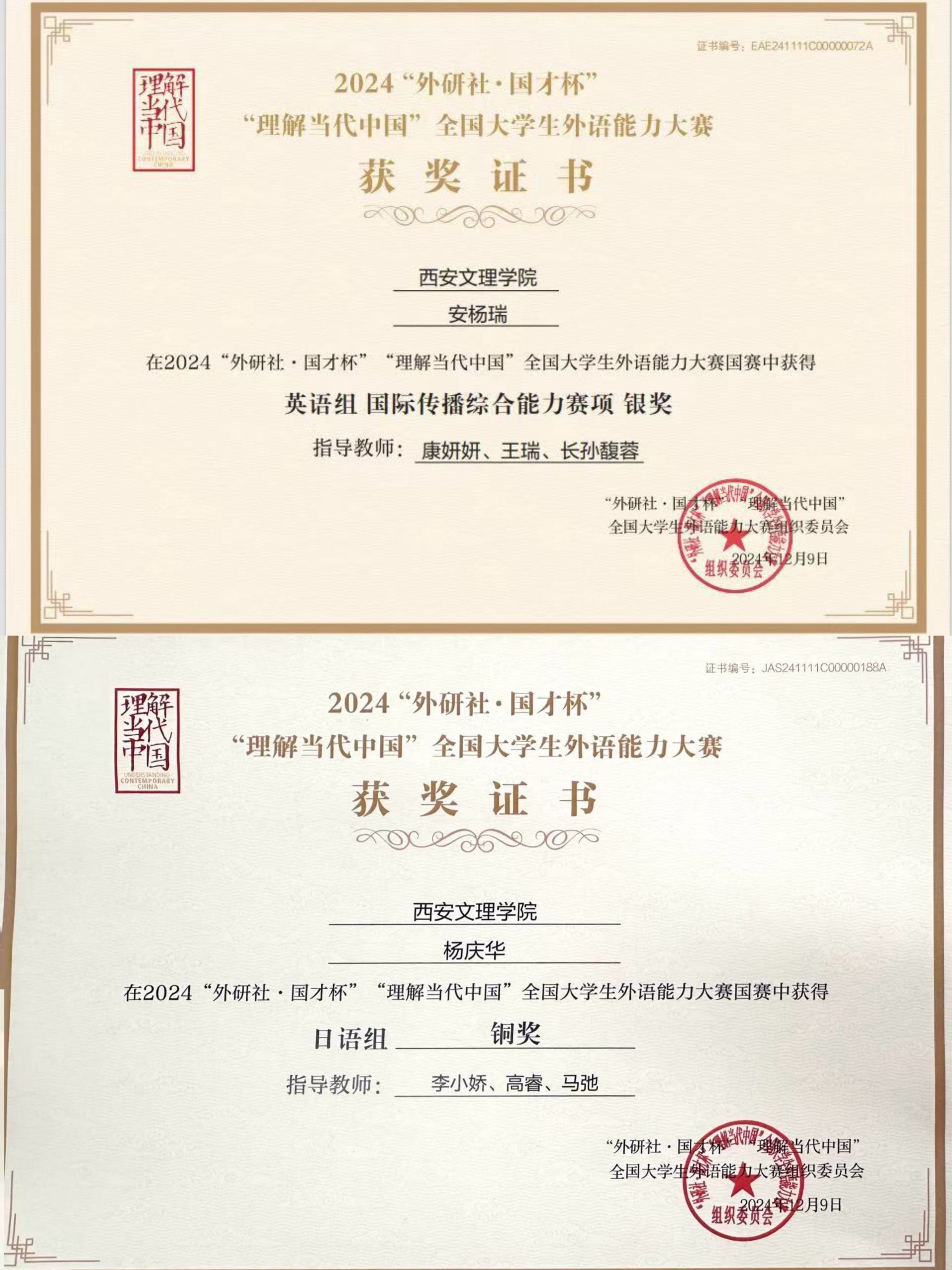 2024年“外研社·国才杯”“理解当代中国”全国大学生外语能力大赛于12月圆满落幕。我校外国语学院翻译专业安杨瑞、日语专业杨庆华两位同学在激烈的竞争中脱颖而出,最终安杨瑞斩获全国总决赛银奖,杨庆华斩获全国总决赛铜奖,实现历史性突破。