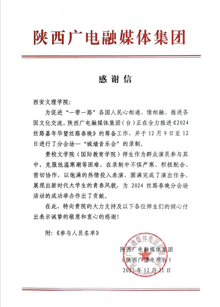 近日,文学院(国际教育学院)收到陕西广电融媒体集团感谢信,对我校组织留学生参与2024丝路春晚活动表示感谢。 12月9日至12月12日,陕西广电融媒体集团(台)进行了2024丝路春晚——“城墙音乐会”的录制。文学...