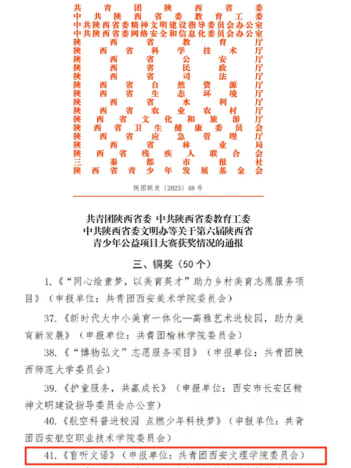 近日,在团省委、省委教育工委、省委文明办等单位的共同推动下,我校“盲听文语”志愿服务项目荣获第六届陕西省青少年公益项目大赛铜奖。 该项目旨在通过“线上线下”的课业辅导活动,提高视障儿童的科学文化水平和思...