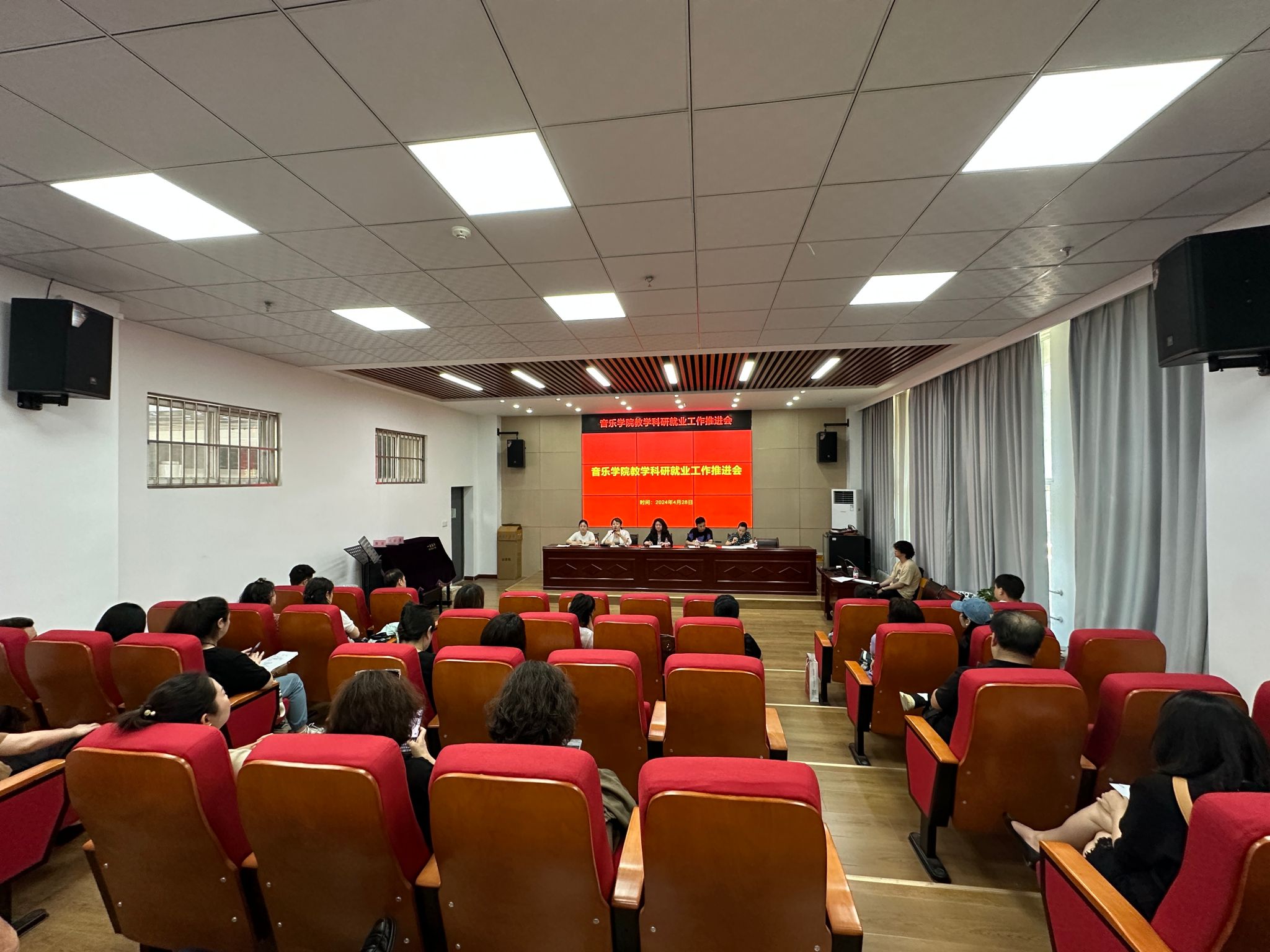 4月28日中午,音乐学院在学术报告厅召开2023-2024学年第二学期教学科研就业工作推进会,学院全体教职工参加会议,会议由学院党总支书记贺星主持。学院党总支委员高婧传达了纪委重要文件及会议精神。强调学院将全面配合学校严查违规违纪行为,并提醒全院教职工以身作则,养成良好行为规范。随后就招生就业工作进行通报,希望全体教师高度重视招生就业工作,为本院学生做好就业服务,帮助学生从思想上正确认识考公、考研及就业相关事宜,...