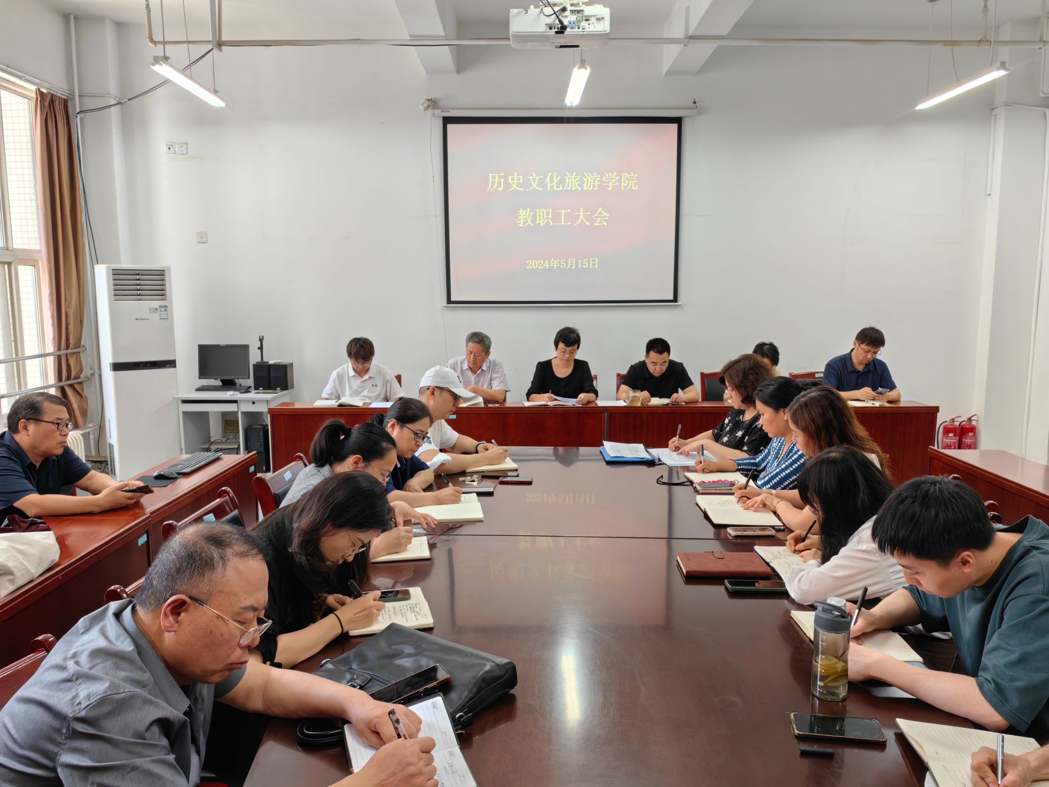 5月15日下午,历史文化旅游学院召开教职工大会暨审核评估动员会,学院领导班子成员、全体教职工参加会议,会议由党总支委员袁博主持。学院党总支书记李东升传达了学校召开的关于迎接本科教学工作审核评估部署会议精神,分别从提高政治站位、推动学院全面发展、展现学院优良教风学风三方面进行了动员和部署;从教学、科研、学生管理和服务保障等角度提出了迎评工作目标,要求责任到人、任务明确、精诚协作、保障有力,全院师生团结一致,...