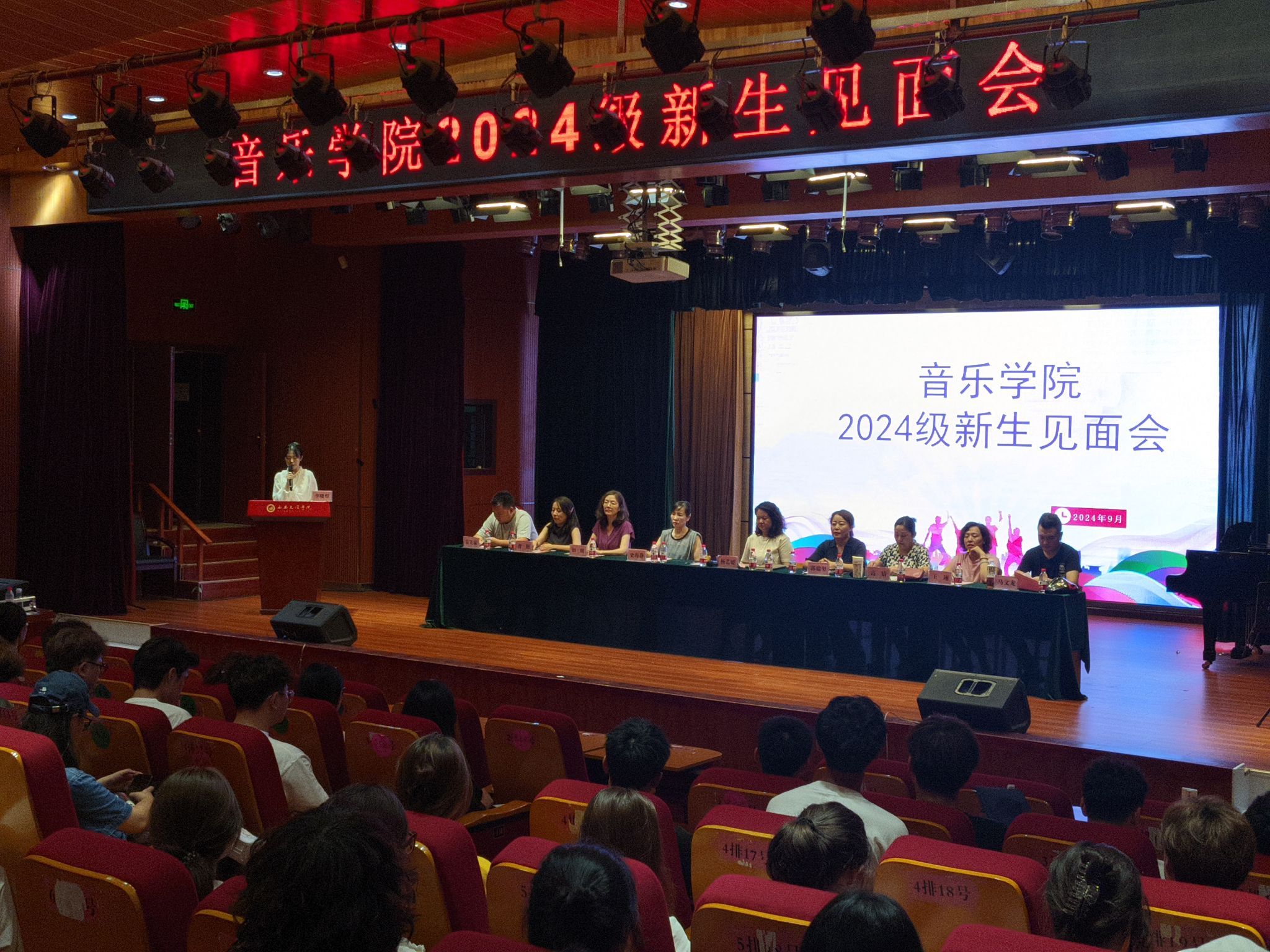 9月4日下午,音乐学院在明德楼D区演播厅举行2024级新生见面会。学院院长杨艺媛,副院长史海静、郭瑞玺,院党总支委员高婧、各系部主任、全体辅导员以及全体24级新生参加会议,会议由学院党总支委员高婧主持。音乐表演2401班蒋宇菡代表新生发言。从严守校规校纪,筑牢和谐校园、学会做事和相处、做好人生规划三个方面呼吁全体24级新生身为时代青年,应树立大局观念,要有方向,敢拼搏,做最好的自己。在风华正茂的年纪书写青春的新篇章。...