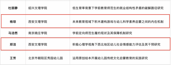近日,学前教育研究机构奕阳教育研究院公示了2024年青年学者研究资助项目名单,学前教育学院杨琼博士主持的《未来教育视域下积木建构游戏与幼儿科学素养启蒙之间的内在机制》、郑洁博士主持的《积极心理学视角下西北地区幼儿社会情感能力评估及其干预研究》获批立项。 本次奕阳教育研究院青年学者研究资助项目共收到全国各地区及英国、德国等80余个机构、大学、幼儿园的126份项目申请书,经初审和复审最终确定30个项目获得资助,其中包括学前教育学院教师申请的2个项目。...